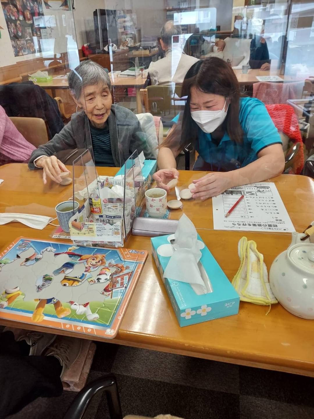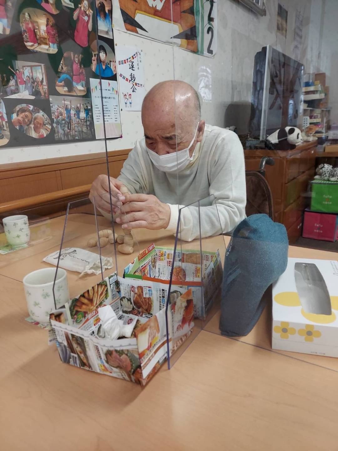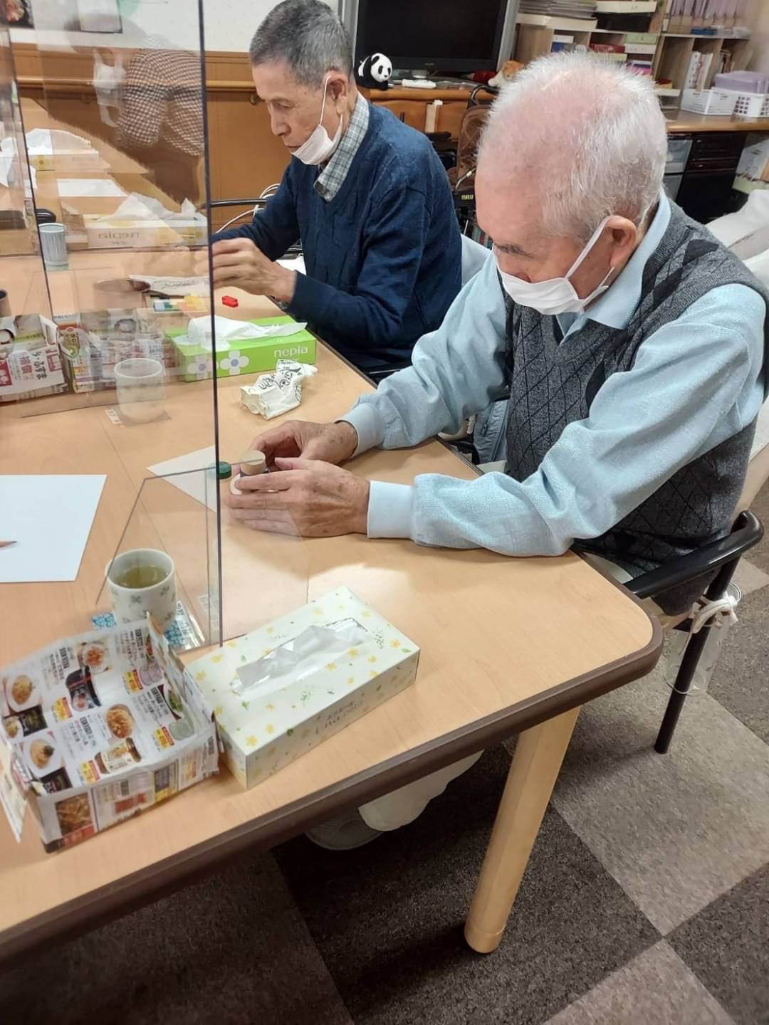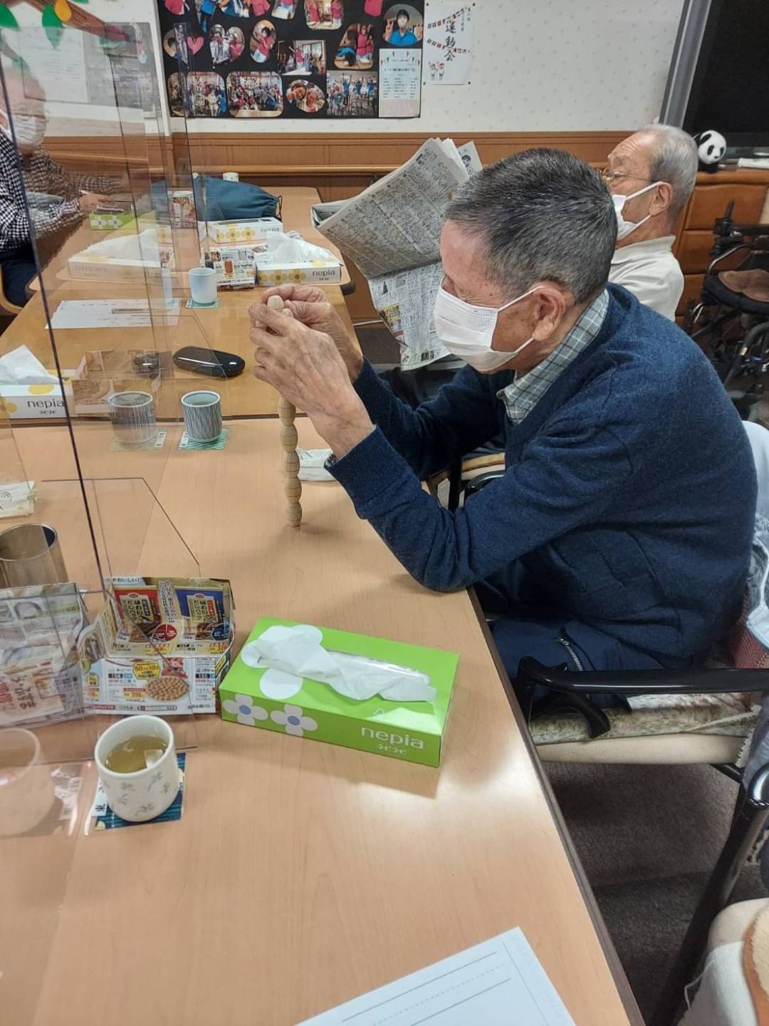 こころ萩原では、自席で座りながらでも、遊び感覚で楽しんでいただけるリハビリを行なっています