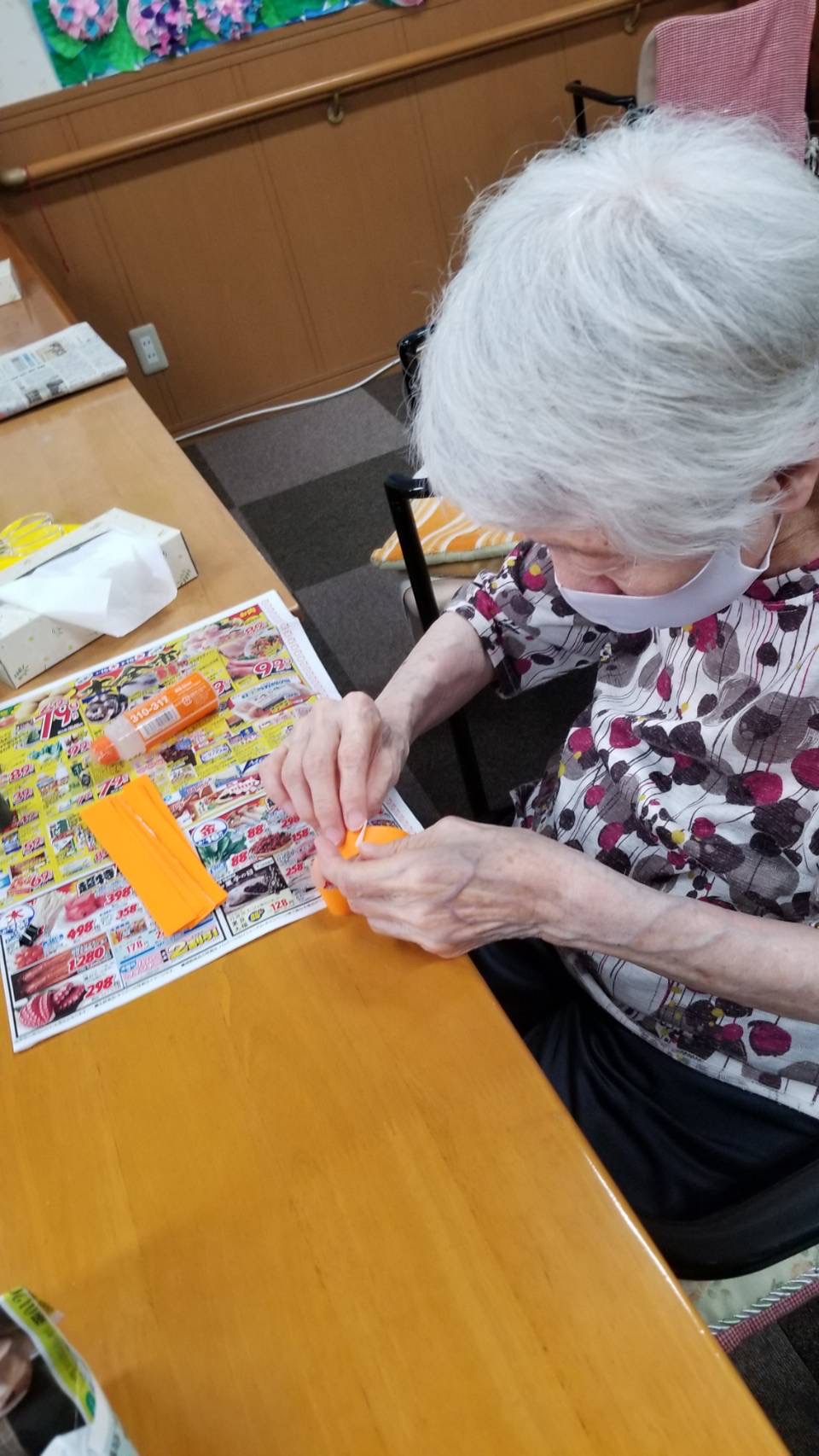 折り紙を切って、貼って輪飾りのレインボーです🌈