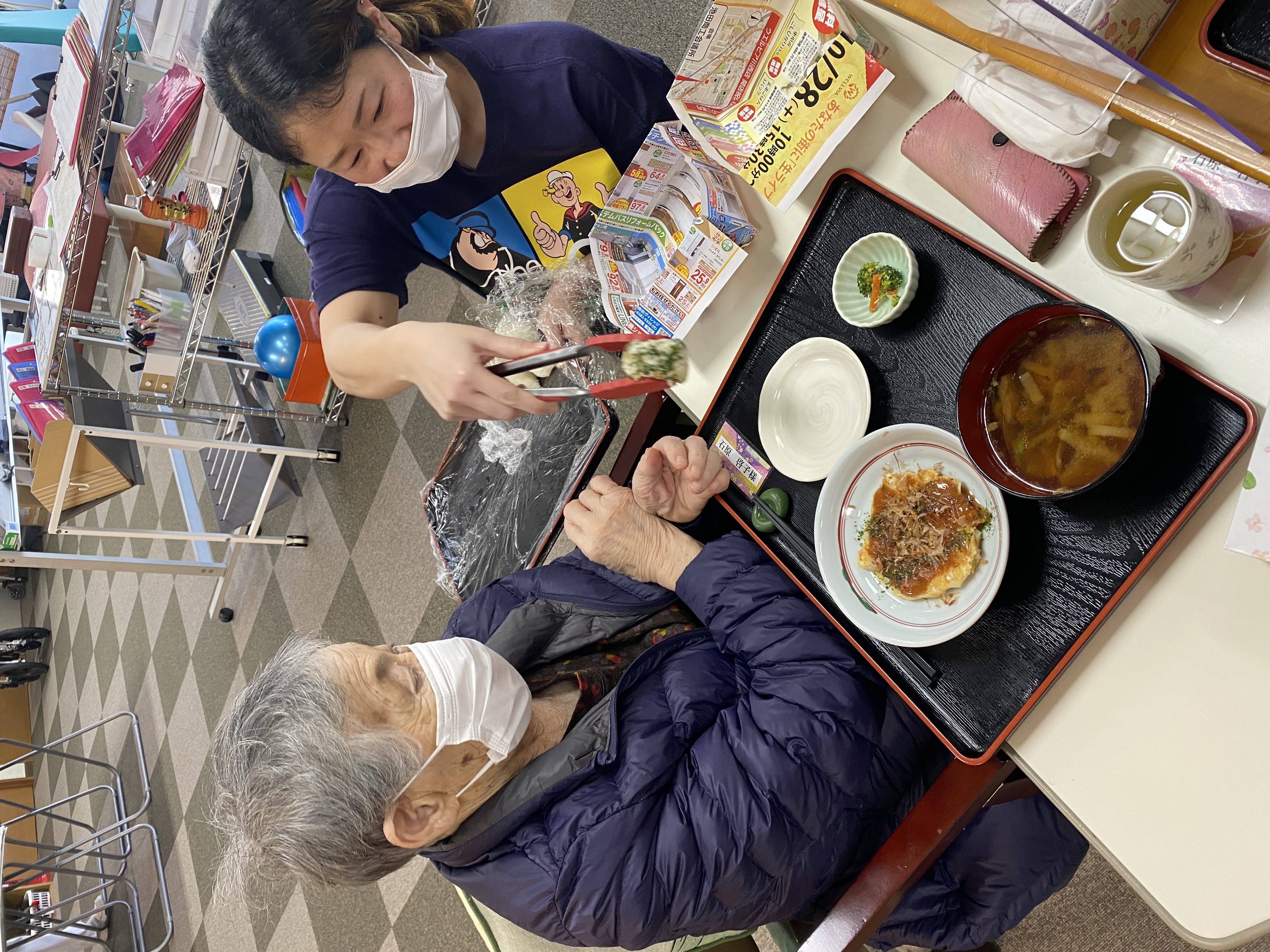 お昼ごはんは 皆さんの前でお好み焼きを焼いて 食レクお行ったんです🎵
